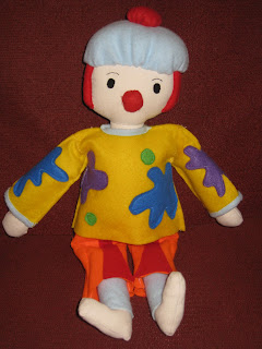 Moja malutka uwielbia bajkę "Jojo z cyrku". Długo poszukiwałam jakiejkolwiek zabawki z tej bajki. Niestety bez rezultatów. Przecież moje dziecko nie mogło pozostać bez ulubionego bohatera, więc pomysłowa mama postanowiła wykonać maskotkę samodzielnie. Długo nad nią pracowałam, ale efekt jest (przynajmniej dla mnie i malutkiej) bardzo zadowalający. Niestety nie zdążyłam jej dokończyć, bo już została porwana do zabawy :). Brakuje jej ust i butów. No właśnie podpowiedzcie mi jak zrobić buty dla Jojo?